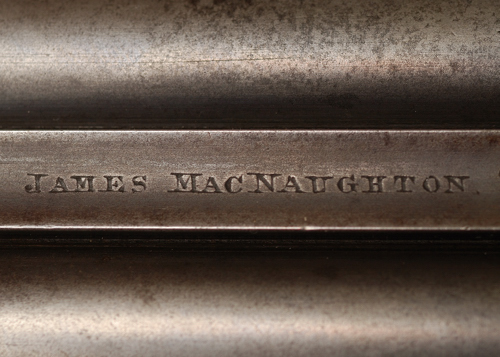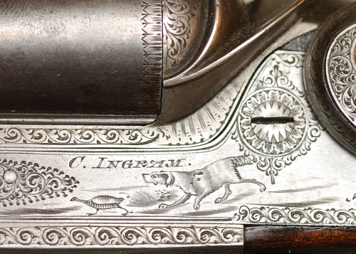 I have a double barrel 12 ga. very similar to yours. The only identifying marks I have been able to find are “Ingram Scotland” and the word “Ingram” on each of the side plates. It has the under lever locking system also. On top of the stock is an engraved brass plate with the following: “PRESENTED TO MR GEORGE GALL ALONG WITH A TELESCOPE BY A FEW FRIENDS ON THE OCCASION OF HIS LEAVING FOR AMERICA, GLASGOW N.B. AUGUST 1882”. I have owned this gun for over 50 years and have never taken it apart, or had the forearm off of it. When I was a teenager and didn’t know any better I would take it hunting and shoot high brass 12 ga. shells in it. It still locks real tight and is in good condition except for one little dent in the right barrel. I don’t know where to look for a serial number if it has one.