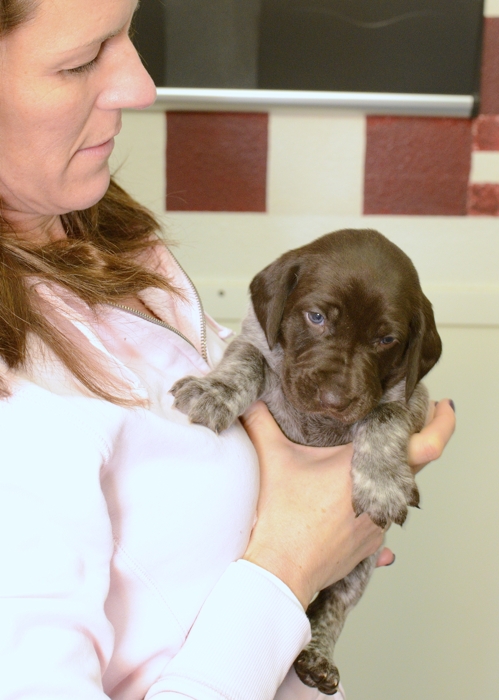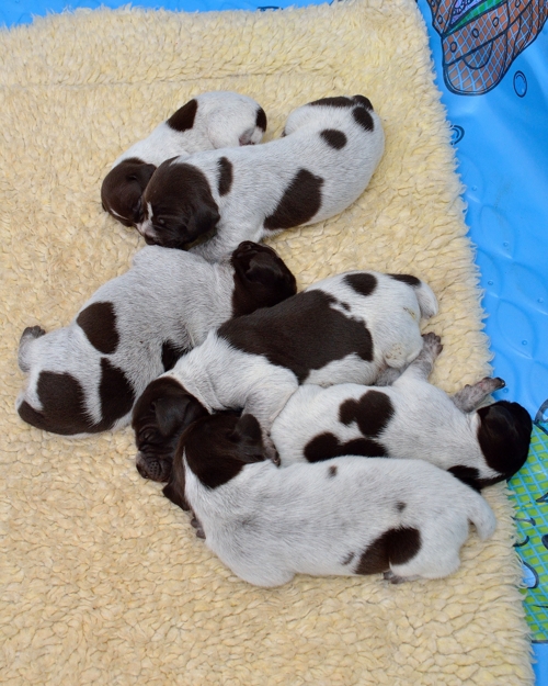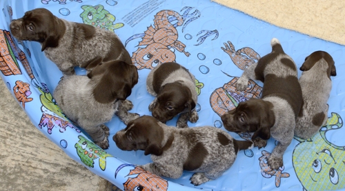 These sweet pups are 24 days old. The litter has 4 females and 2 males and we will pick between these two males. One is about the largest dog in the litter and the other is the smallest. Other than the female in pink, which one would you choose?
