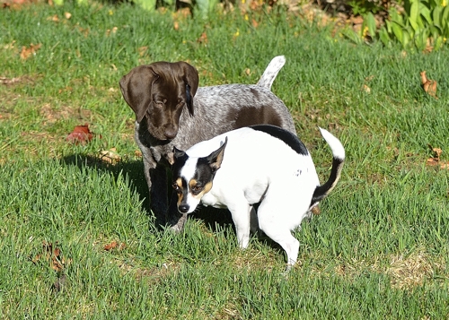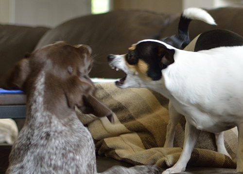 Dogs playing “happily” together.
