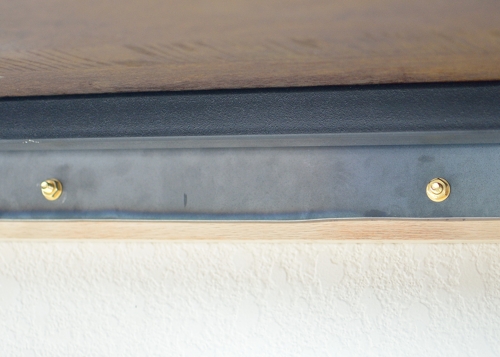 Welded to the back of the plate is a 6″ flange that hangs below the table. This is a picture of the underside of the table showing the flange bolted to a  1×3 piece of red oak that is lag bolted into studs in the wall. The result is a rock solid mount.