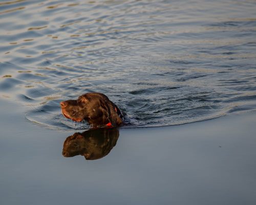 Tex takes a swim in a Texas stock pond during our annual dove hunt. The still morning gave us a pool of glass, reflecting a very happy puppy.