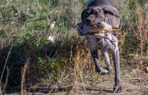 This versatile hunting dog is well trained and obediently brings birds to hand.