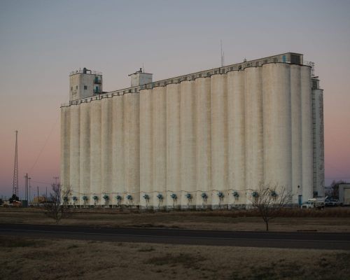 Grain silos at dawn.