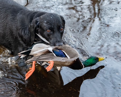 Soon, the first squadron of mallards come dropping into the clearing, cupping their wings to land, and the guide yells “TAKE ‘EM!” The shooting is fast and exciting, over in a few seconds. Melly is back in the water, fetching the downed ducks back to the guide. Five birds are now hanging in the game carrier straps. This is repeated for an hour or so until the limits are filled. It is like a roller-coaster ride, super exciting action, but over all too soon.