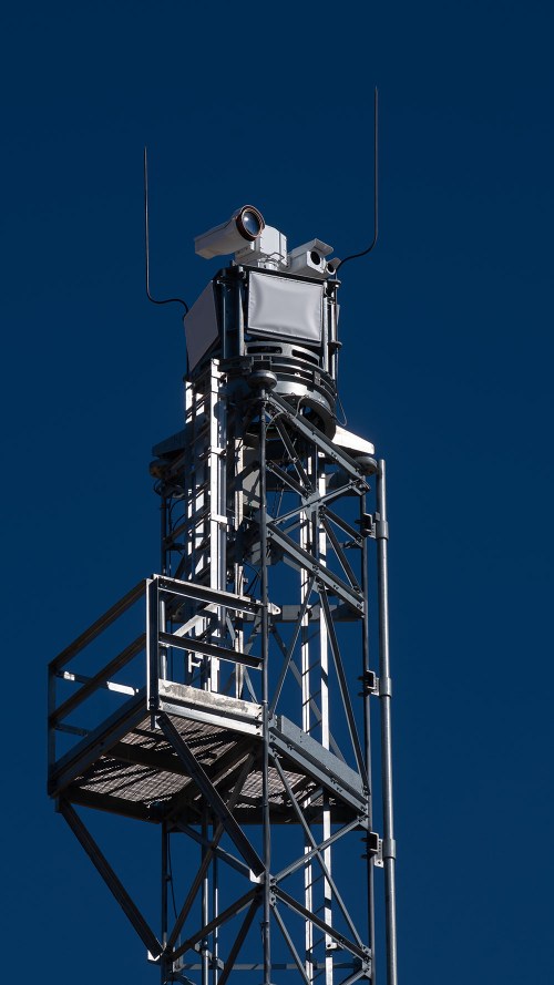 Here is part of that virtual wall. Towers like this are seen every mile or so along the border and seem to be loaded with hi-tech optics.  Notice the TARS blimp just above the hills.