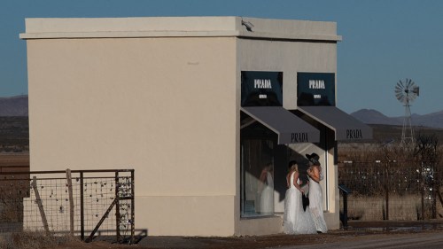 The Marfa Prada outlet. An artistic joke, in the middle of nowhere, complete with two smoking hot bimbos.