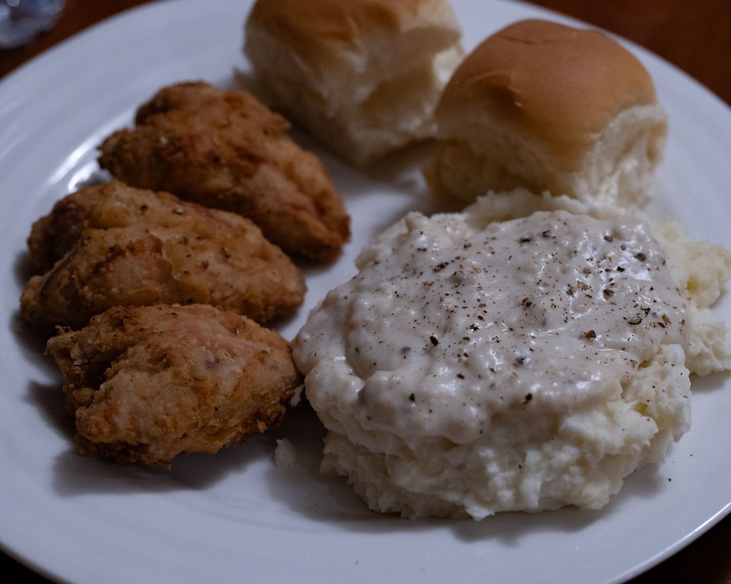 Fried quail, mashed potatoes with peppery cream gravy and soft rolls. This is some good eating!