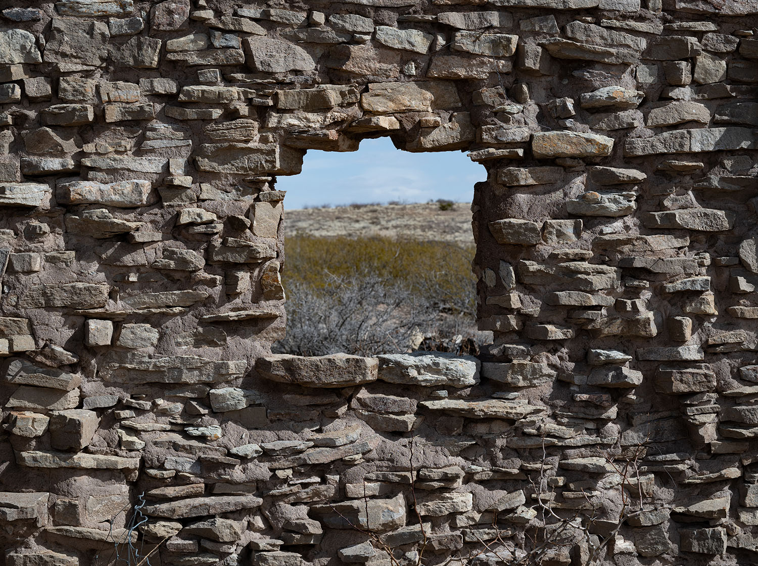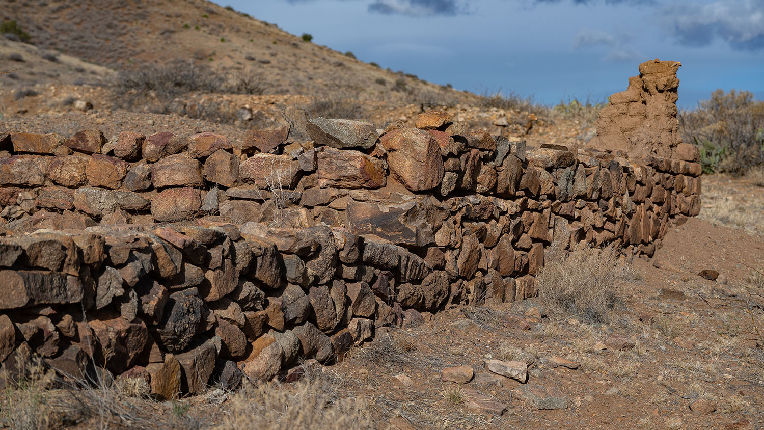 A wall of stone stands alone. The rest of the structure is long gone. There are many of these kinds of ruins in the old mining country.